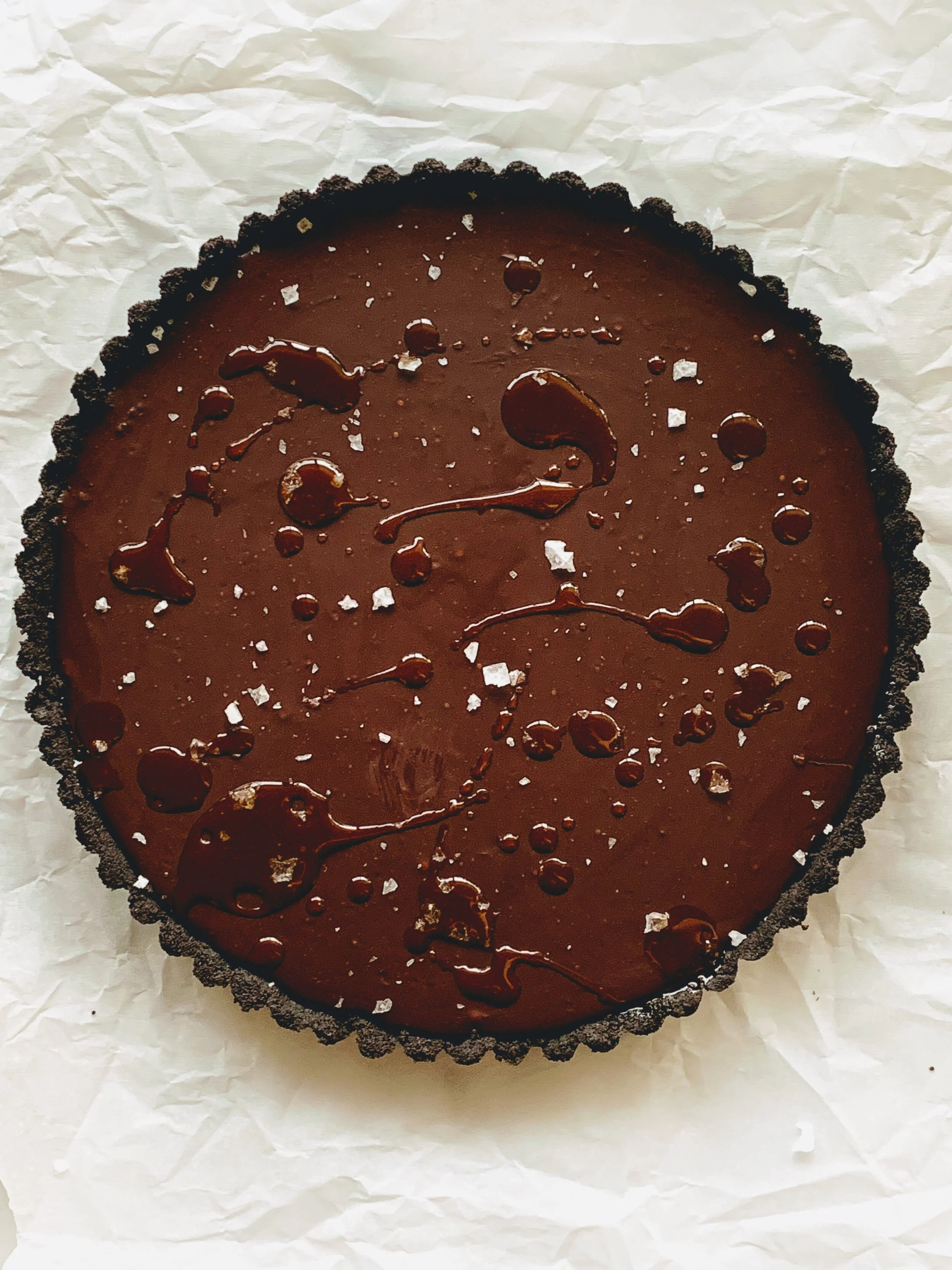 Here’s a little moody bittersweet chocolate tart situation for your Fine Art Friday pleasure. A chocolate cookie crust filled with an orange flavored chocolate ganache, artfully drizzled with a good quality olive oil and flaky sea salt. This is a chocolate lover’s dream, sinfully good, and decadent AF. It’s quite possibly the epitome of perfection in chocolate form. It’s OK if you don’t want to share.