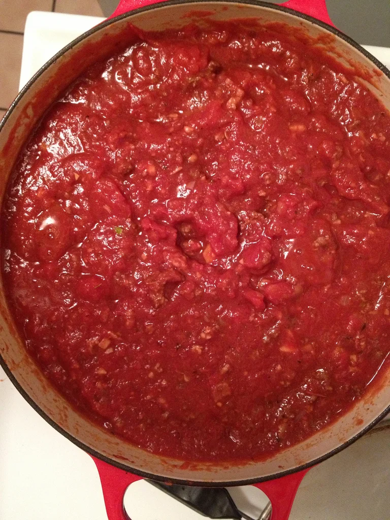 Over medium heat, heat 2 tablespoons of olive oil and sweat the minced onions and garlic in the soup pot until translucent, about 5 minutes. Next add Italian seasoning, chili flakes, garlic powder, salt, and tomato paste. Cook for 5 minutes, stirring constantly until the tomato paste has thickened slightly and darkened in color. Deglaze the pan with red wine and balsamic vinegar. Continue stirring to scrape up any brown bits that may have formed on the bottom of the pan. Add crushed tomatoes and stir to combine the tomato paste mixture. Then, return all of the meat to the pot. Give everything a good stir and throw in the bouquet garni, burying it in the sauce. Bring sauce up to a boil, cover and then reduce heat to low. Let the sauce simmer for at least 2 hours. 3 would be better. Make sure to stir and taste occasionally to check if the sauce needs any additional seasoning. Somehow the bolognese gods were with me the day I made this and I didn't have to add anything else to the sauce. I just let it cook for hours and the flavors developed wonderfully on their own. At the end of 3 hours, your sauce should be very thick. Remember WATER IS THE ENEMY!!